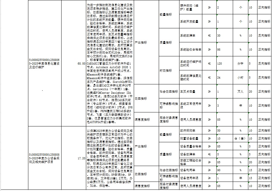 2025年化工设计院开展绩效目标管理的项目16个,涉及预算3606.4万元。其中:人员类项目4个,涉及预算2224.43万元;运转类项目12个,涉及预算1381.97万元;特定目标类项目0个,涉及预算0万元。